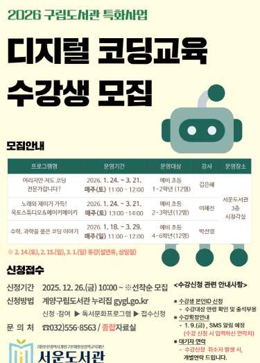 서운도서관 관계자는 “디지털 코딩 교육을 통해 어린이들의 디지털 리터러시와 창의적 문제해결 능력이 한층 향상되기를 기대한다.”라며, “이번 프로그램이 수강생들에게 실질적인 도움이 되길 바란다.”라고 전했다.
