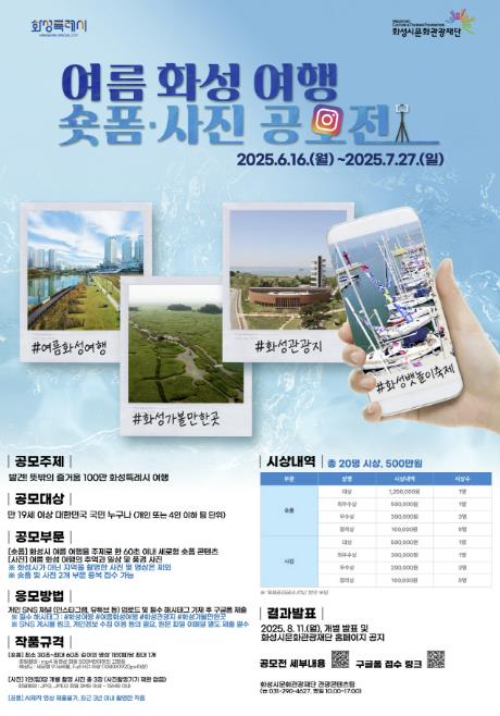공모기간은 6월 16일부터 7월 27일까지이며 만 19세 이상의 대한민국 국민이라면 누구나 참여 가능하다. 공모주제는 ‘발견! 뜻밖의 즐거움, 100만 화성특례시 여행’으로 화성시의 다양한 관광지를 창의적이고 매력적으로 표현하면 된다.