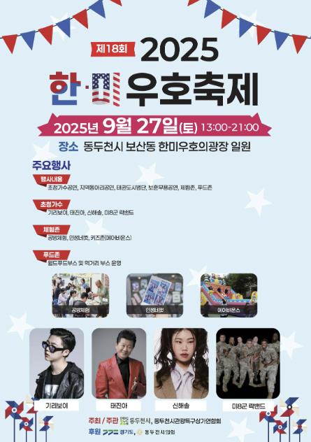 공연도 풍성하다. 지역공연팀과 보훈무용협회, 태권도시범단이 한국 문화를 담은 무대를 선보이고, 미8군 락밴드가 출연해 양국이 함께 어울리는 무대를 연출한다. 이어 동두천시 홍보대사 신해솔, 힙합 아티스트 기리보이, 트로트 가수 태진아가 무대에 올라 세대를 아우르는 열정적인 공연으로 축제의 분위기를 고조시킬 예정이다.