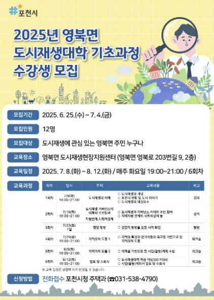 교육은 오는 7월 8일부터 8월 12일까지 매주 화요일 오후 7시 영북면 도시재생현장지원센터(영북면 영북로203번길 9, 2층)에서 진행한다.