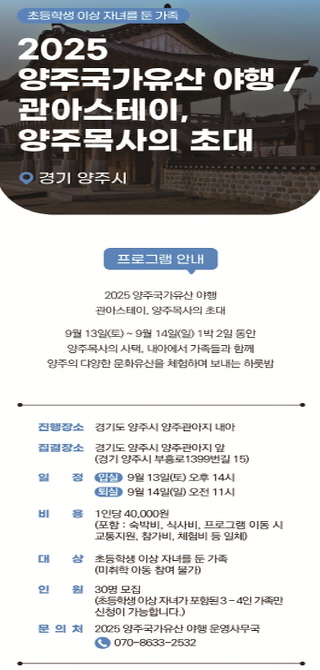 ‘야숙(夜宿)’은 과거 양주목사가 가족과 함께 생활했던 공간인 양주관아지 내아에서 하룻밤을 보내는 체험 프로그램으로, 9월 13일부터 14일까지 진행된다.