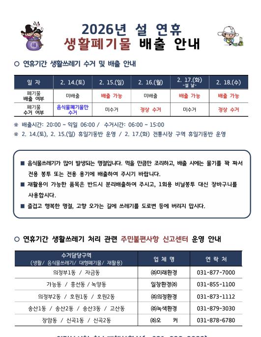 시는 이번 대책을 통해 ▲생활쓰레기 수거 일정 조정 ▲기동처리반 운영 ▲청소 사각지대 점검 등을 중점적으로 추진한다. 청소대책 상황실은 2월 14일부터 18일까지 5일간 자원순환과, 의정부도시공사, 5개 청소대행업체가 협력해 운영하며, 연휴 기간 발생하는 생활쓰레기 관련 민원에 신속히 대응할 예정이다.