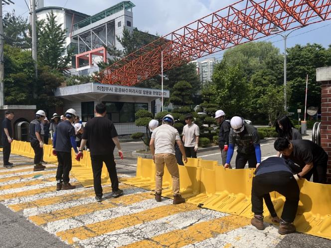 참여자들은 2인 1조로 차수판 설치와 분해를 반복 훈련하며 신속한 우수 차단과 응급상황 대응 역량을 높였다. 훈련 이후에는 시설 주변 도로의 우수받이와 배수로를 정비해 배수 기능을 한층 강화했다.