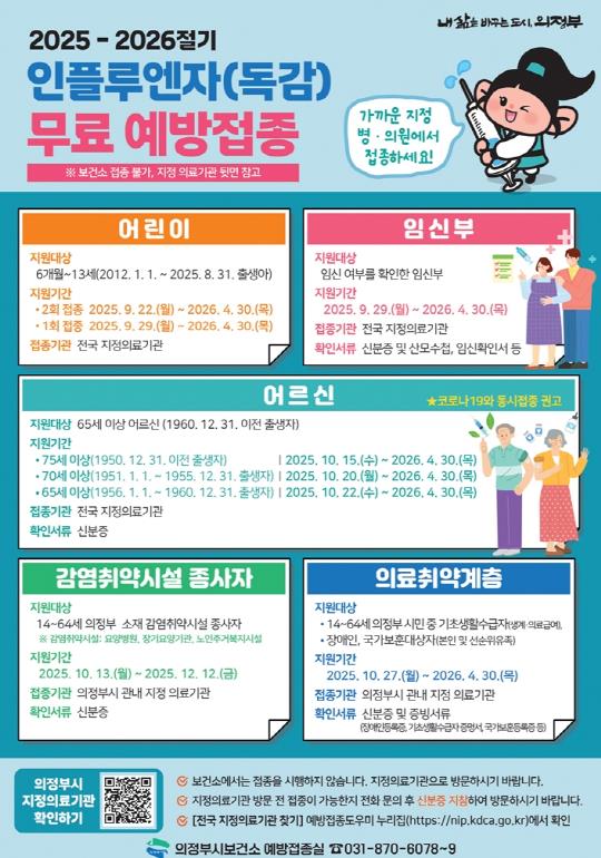 이번 접종은 다가오는 겨울 독감(인플루엔자) 유행에 대비해 감염 시 중증화 위험이 큰 ▲6개월~13세(2012년 1월 1일~2025년 8월 31일 출생자) 어린이 ▲임신부 ▲65세 이상(1960년 12월 31일 이전 출생자) 노인 ▲의정부시 소재 감염취약시설(요양병원, 장기요양기관, 노인주거복지시설) 종사자 ▲의정부 시민 중 의료취약계층(생계‧의료급여 수급자, 장애인, 국가보훈대상자)을 대상으로 무료로 진행한다.