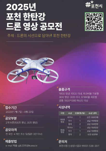 총 상금은 1,000만 원이며, 수상작은 오는 10월 열리는 ‘포천 한탄강 세계드론제전’ 현장에서 상영될 예정이다. 아울러 포천시청 공식 유튜브, SNS, 관광홍보물 등 다양한 디지털 매체에도 활용된다.