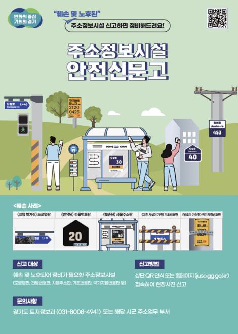 아울러 스마트 주소정보시설에 부착된 QR코드를 통해 산불방지, 찾아가는 정약용 도시대학 등 다양한 시책 및 홍보자료를 제공해 디지털 기반의 생활 밀착형 정보 서비스도 지속 확대한다. 주소정보시설이 훼손되거나 노후해 정비가 필요할 경우 ‘국민신문고’ 및 ‘경기도 주소정보시설 안전신문고’를 통해 신고할 수 있다.