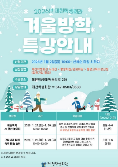 제천학생회관(관장 서봉옥)은 “겨울방학을 맞은 학생들이 AI 기술과 미술 놀이를 통해 창의력과 상상력을 키우며, 즐거운 겨울방학의 추억을 만들길 바란다.”고 말했다.