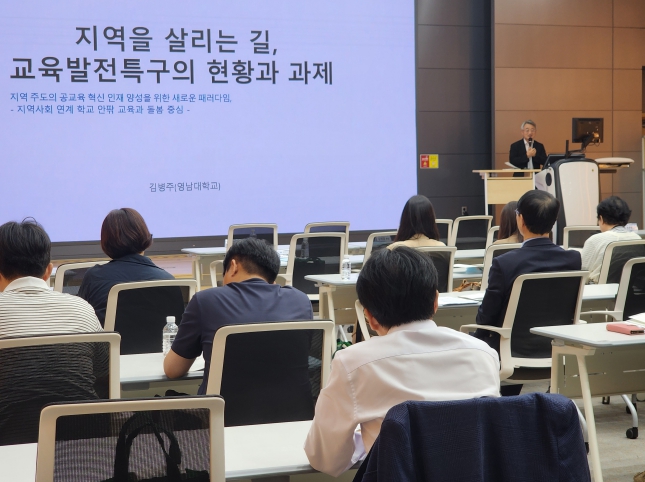 이번 대전교육발전포럼은 ‘지역을 살리는 길, 교육발전특구의 현황과 과제’를 주제로 교직원, 학부모, 교육전문(행정)직원, 대전시청, 지역대학 관계자들을 대상으로 진행됐다. 영남대학교 김병주 교수가 전문가 발표자로 참여했고, 지정 토론자로는 대전시교육청 혁신정책과 이종직 장학관, 초등교육과 오민영 장학사, 대전갑천중학교 전국화 교사가 참여하여 교육청 및 학교 현장의 다각적 관점에서 논의가 이루어졌다.