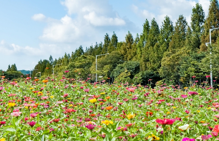 백일홍 꽃단지에는 붉은색, 분홍색, 주황색 등 다채로운 꽃들이 만개해 방문객들에게 색다른 정취를 선사하고 있다.