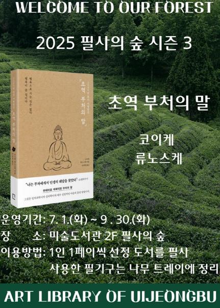 필사의 숲은 미술도서관만의 독서 프로그램으로 매년 시민들의 꾸준한 참여 속에 운영 중이다. 지난 2월 첫 번째 필사 도서인 한강 작가의 '서랍에 저녁을 넣어 두었다'를 시작으로, '작은 땅의 야수들'에 이어 7월에는 '초역 부처의 말'을 세 번째 필사 도서로 선정해 운영할 예정이다.