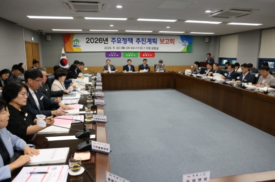 보고회 순서는 2026년도 정책 여건과 재정 전망, 시정 운영 방향, 핵심 정책과제에 대한 전략기획감사실장의 총괄 브리핑 후 부서별 신규 시책과 주요 정책에 대한 업무 보고가 진행됐다.