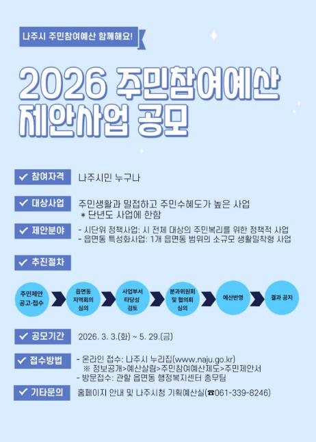 나주시는 2027년 본예산에 반영할 주민참여예산 제안사업 공모를 오는 5월 29일까지 진행한다고 4일 밝혔다.