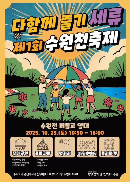 이번 축제는 오전 11시부터 오후 4시까지 진행되며, 다양한 다문화와 지역 주민들이 어우러지는 특별한 장이 될 예정이다.‘수원천축제추진위원회’는 권선구 세류1·2·3동 주민자치회가 공동으로 협력하여 만든 단체로, 지역사회가 함께하는 축제 개최를 통해 다문화 이해 증진과 주민 화합을 목표로 하고 있다. 이번 행사는 다채로운 공연, 체험 부스, 먹거리 장터 등이 마련돼 방문객들에게 풍성한 즐길 거리를 제공될 예정이다.