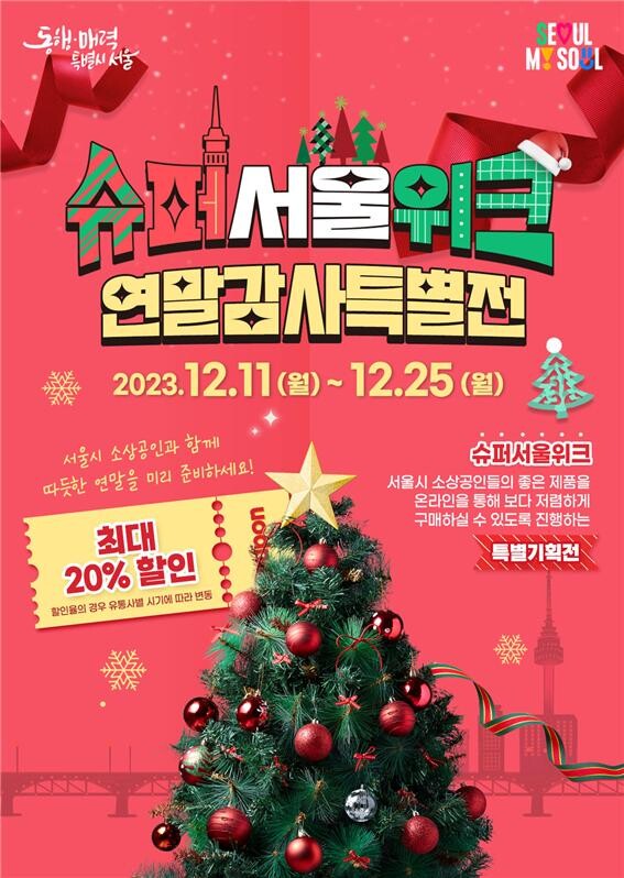 서울시는 11일부터 25일까지 ▴11번가 ▴우체국쇼핑 ▴G마켓 ▴옥션 ▴롯데온 5곳의 온라인쇼핑플랫폼에서 소상공인 제품을 저렴하게 판매하는 ‘슈퍼서울위크 - 연말감사특별전’을 개최한다.