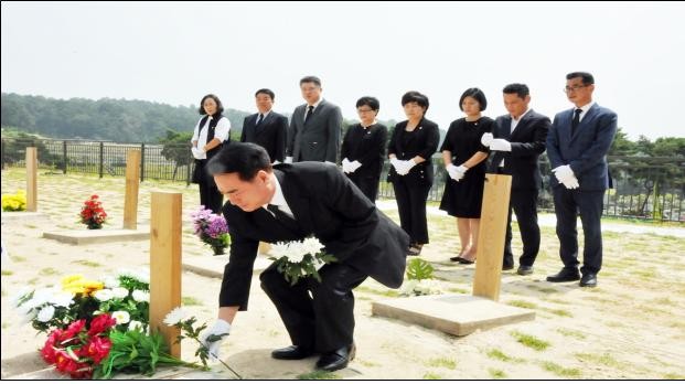 | ▲ 서명석 대전중구의회 의장이 순직 장병 묘역에서 헌화하고 있다. |