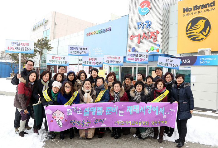 | ▲ 단진시청 직원과 한국소비자교육중앙회 당진시지회 회원 등이 지난 20일 당진전통시장에서 설명절 전통시장이용하기 캠페인을 전개한 후 기념촬영하고 있다.<사진제공=당진시청> |