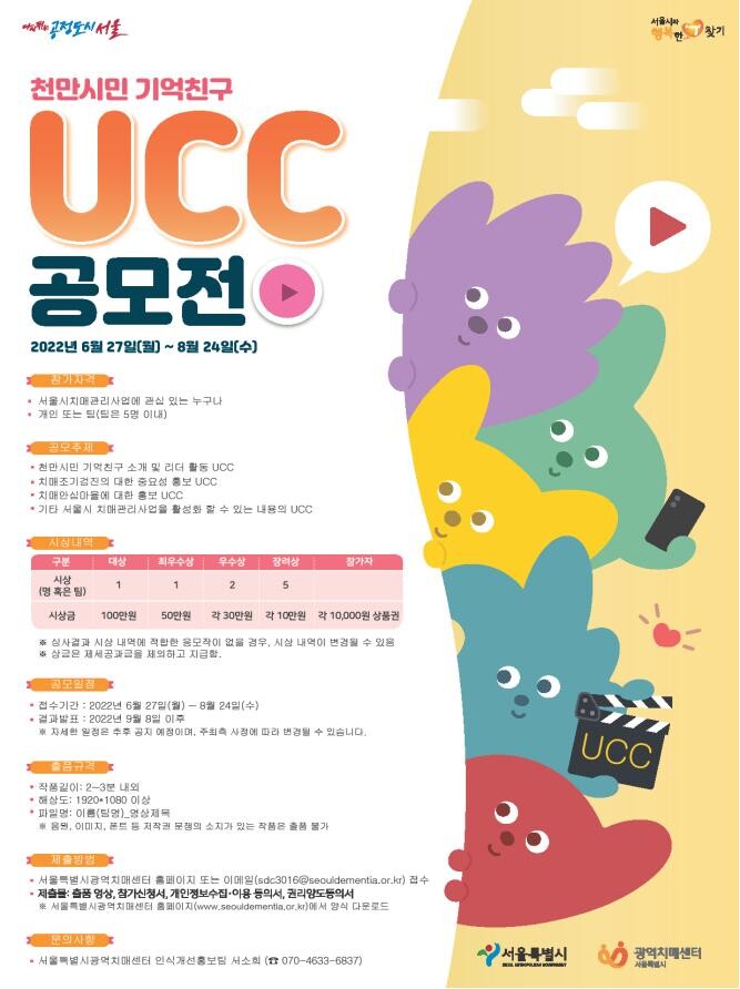 공모 주제는 ▴천만시민 기억친구 프로젝트 홍보 ▴기억친구, 기억친구리더 활동 소개 ▴서울시 치매관리사업(치매조기검진, 치매안심마을 등)을 활성화할 수 있는 내용이다.