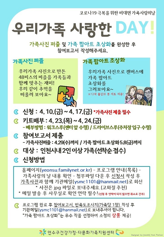 [세계로컬타임즈 장선영 기자] 인천시 연수구 건강가정다문화가족지원센터는 ‘코로나19’에 따라 사회적 거리두기로 위축된 시민들을 위해 가족 사랑의 날 비대면 프로그램 ‘우리 가족 사랑한 DAY’를 진행한다.