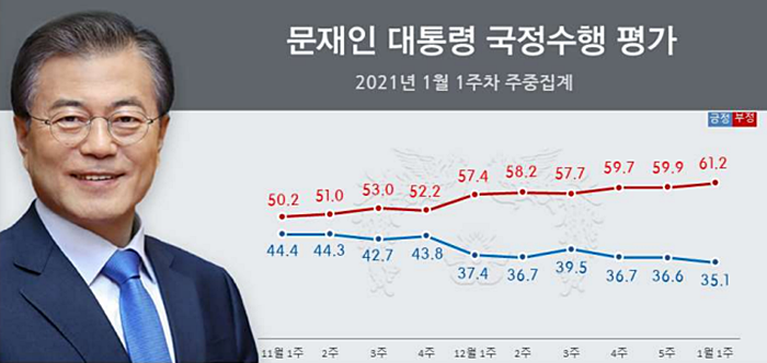 7일 여론조사전문기관 리얼미터가 YTN 의뢰로 실시한 1월1주차(4일~6일) 주중 잠정집계 결과, 문 대통령의 국정수행 지지율 관련 긍정평가는 전주 대비 1.5%p 하락한 35.1%로 조사됐다. ‘매우 잘함’ 응답 17.8%에 ‘잘 하는 편’ 17.3%를 합친 결과다.