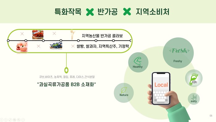 지역 농특산물인 복숭아, 블루베리, 토마토, 쌀을 활용한 반가공제품을 생산해 지역소비처 연계 로컬푸드 가공품으로 육성하겠다는 추진 전략과 계획이 좋은 평가를 받았다.