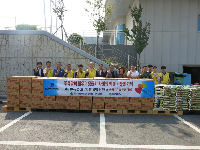 [세계로컬신문 최원만 기자] 경기도 오산대학교(총장 정영선)는 지난 25일 오산시 신장동 행정복지센터에 추석을 맞아 불우한 이웃을 돕고자 사랑의 백미와 라면을 기탁했다.