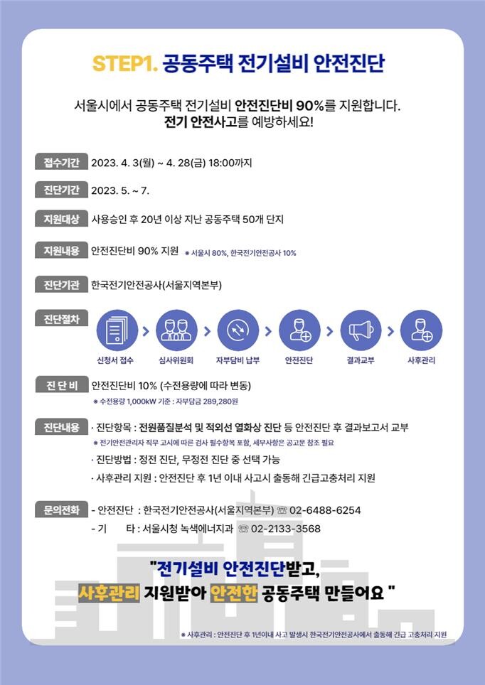 이에 서울시는 20년 이상 된 노후 공동주택(2004년 이전) 50개 단지에 전기설비 안전진단 비용 90%를 지원해 전력 소비량이 급증하는 여름철 정전 및 안전사고에 대비할 계획이다.