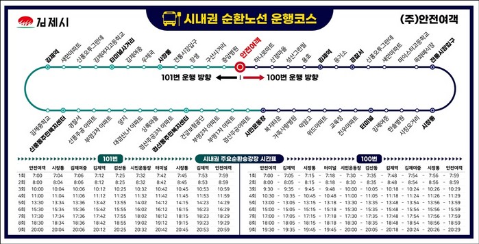 100번 시내버스는 07:00(첫차)~19:30(막차)까지 안전여객 차고지(교동)에서 출발해 하나로마트→김제역→시장통→터미널→시민운동장→검산동→김제역→시장통→안전여객 차고지로 운행하며 101번 시내버스는 07:00(첫차)~20:00(막차)까지 100번 노선의 반대 방향으로 운행된다.