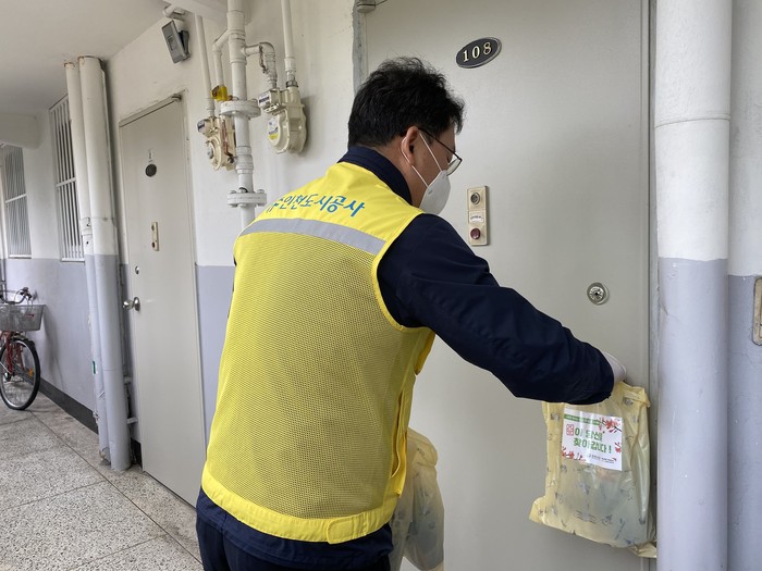 | ▲ 인천도시공사 봉사단원이 비대면 방식으로 봄나눔 선물을 걸어두고 있다. (사진=인천도시공사 제공) |