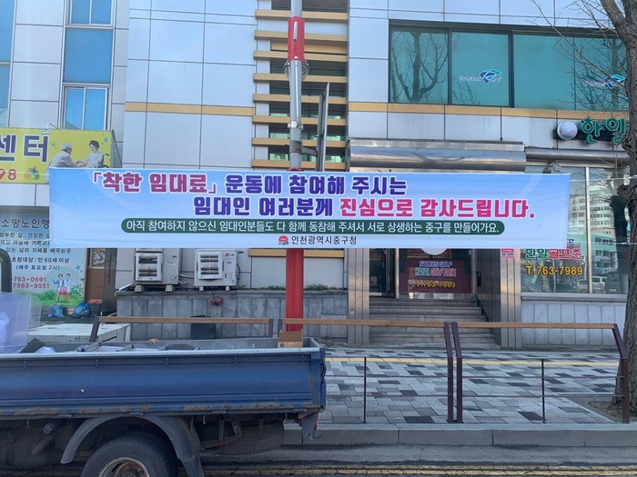 | ▲ 중구 곳곳에 '착한임대료' 운동 현수막이 걸려 있다. (사진=인천 중구청 제공) |