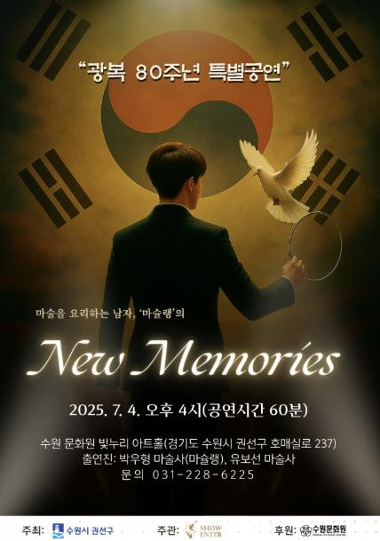 쇼엔터 대표 박우형 마술사(가명 마슐랭)는 마술학과 출신 20년 공연 경력을 지닌 베테랑 마술사로 ‘마슐랭의 New Memories’공연을 통해서 ‘기억하고, 감동하고, 이어가는 것’의 광복80주년 가치를 초등학생과 가족단위 관객에게 희망의 선물을 선사할 예정이다. 무료로 진행되는 이번 공연은 6월중에 수원시 시민참여 플랫폼 ‘새빛톡톡’ 앱을 통해 신청할 수 있고 선착순으로 마감된다.