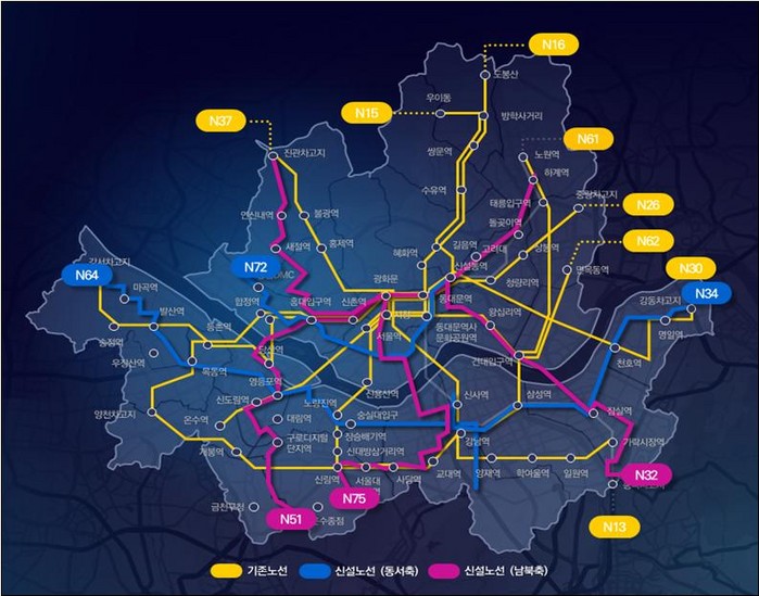서울시는 데이터 및 시민 이동 수요 분석과 함께 그간 연말 한시적으로 운행했던 심야노선의 운행자료와 시민 의견 등을 종합적으로 고려해 △심야시간대 이동 사각지역에서 도심・강남간 동서축 연계 노선 (3개) △한강을 중심으로 남·북축의 도심과 부도심 연결 노선(3개) 등 총 6개 노선을 새롭게 구축했다.