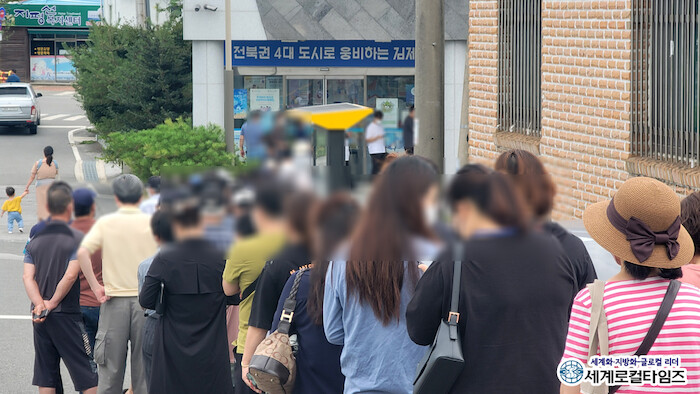| ▲지난 9월 3일, 김제시의 일상회복지원금을 지급받기 위해 신풍동행정복지센터 앞에 긴 대열이 만들어 졌다.(이하 세계로컬타임즈 DB) |