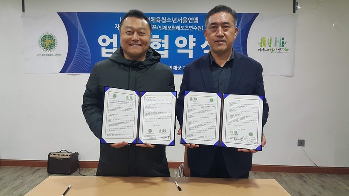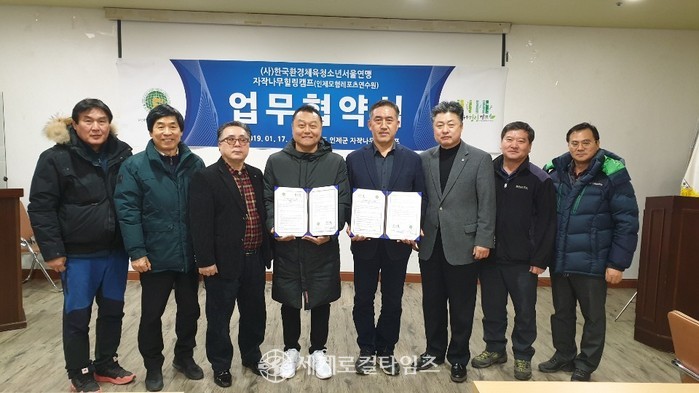 환경캠페인을 통한 환경보호 인식 제고와 체육활동을 통해 청소년들의 체력 증진 및 인성교유에 대한 새로운 실천방안을 제시하고 있는 한국환경체육청소년연맹(이하 연맹)과 자작나무힐링캠프(이하 캠프)가 17일 오후 강원도 인제군 자작나무힐링캠프에서 상호 협력 발전을 통한 청소년 인성교육과 환경 교육을 위한 공동 프로젝트 수행과 상호 발전을 위한 업무협약을 체결했다.