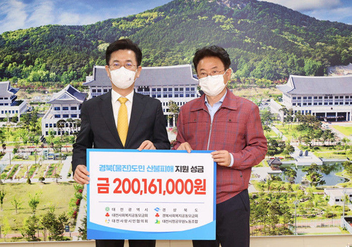 대전시는 허태정 대전시장과 정태희 대전사회복지공동모금회장, 조광휘 대전사랑시민협의회장, 김성용 대전시공무원노조위원장 등 지역대표 4명이 23일 오전 9시 경북도청을 방문해 이철우 경북도지사에게 2억 여만 원의 성금과 이츠수 5천 병을 전달했다고 밝혔다.