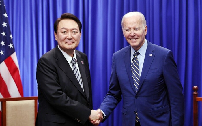 | ▲ 윤석열 대통령과 조 바이든 미국 대통령이 지난 13일(현지시간) 프놈펜 한 호텔에서 열린 한미 정상회담에서 악수하고 있다.(사진=대통령실) |