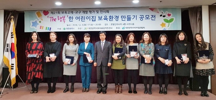 ▲ 구재교(왼쪽 다섯 번째) 노인보육과장이 더 행복한 어린이집 보육환경 만들기 교재, 교구 공모전 수상자들과 함께 기념촬영을 하고 있다. (사진= 대전시 제공) |