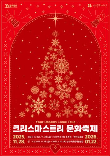 [세계로컬타임즈] 연수구가 주최하고 (재)연수문화재단이 주관하는 ‘2025 크리스마스트리 문화축제’가 내년 1월 22일까지 구청 1층 송죽원과 한마음광장, 연수구 제2청사에서 열린다.