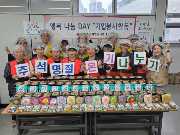 [세계로컬타임즈] 인천중구자원봉사센터는 민족 최대 명절인 추석을 맞아 지난 24일 인천공항에너지㈜(대표이사 이경용) 임직원과 함께 ‘온기 나눔 캠페인’과 연계한 ‘추석 명절 음식 나눔 행사’를 진행했다고 밝혔다.