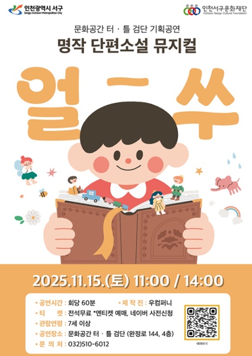 인천서구문화재단은 11월 15일 오전 11시와 오후 2시, 문화공간 터·틀(검단)에서 첫 번째 기획공연인 국악뮤지컬 '얼쑤'를 선보인다.