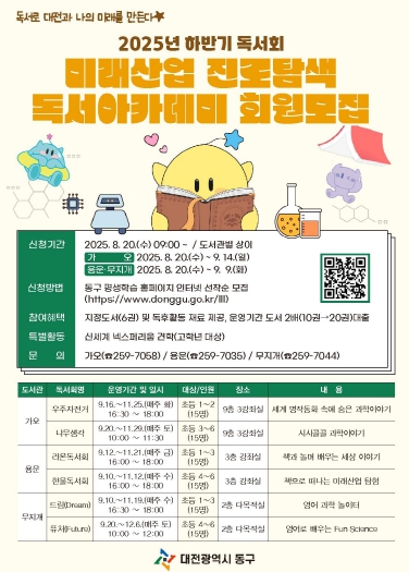박희조 동구청장은 “이번 독서아카데미는 독서라는 친숙한 매개를 통해 미래산업을 쉽고 흥미롭게 접할 수 있도록 준비한 프로그램”이라며 “어린이들이 자신의 적성과 흥미를 찾고 진로에 대한 생각을 키워나가는 뜻깊은 시간이 되길 바란다”고 전했다.