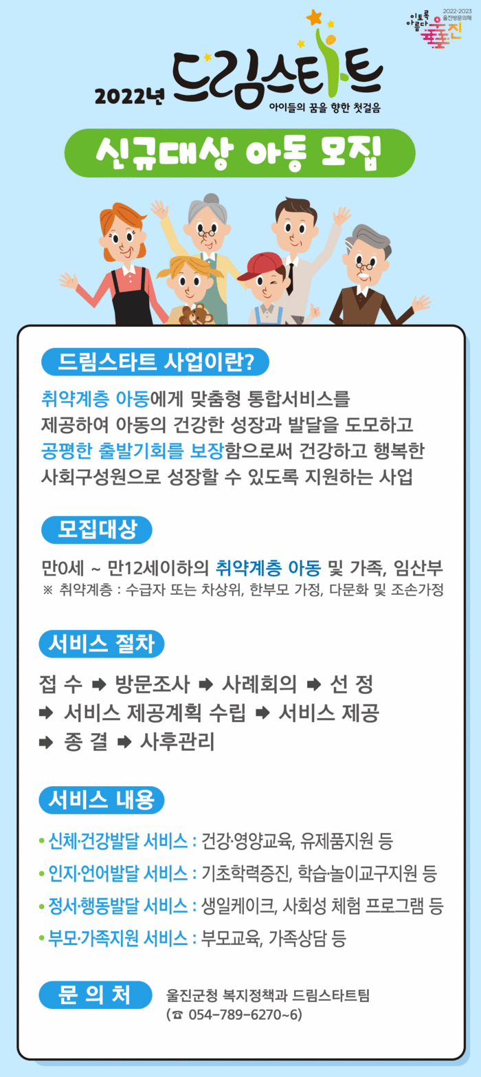 [세계로컬타임즈 이장학 기자] 울진군은 2022년을 맞아 취약계층 아동의 복지 사각지대 해소를 위해 드림스타트사업의 신규대상자 발굴을 시작한다고 4일 밝혔다.