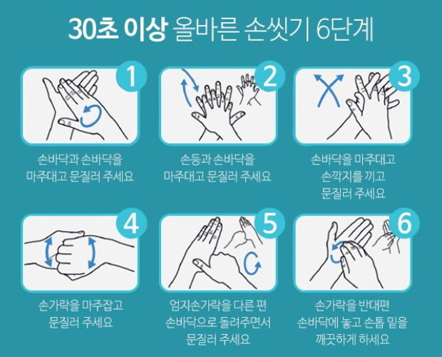 이런 손씻기의 효과는 ▲손바닥과 손바닥을 마주대고 문질러 주기 ▲손등과 손바닥을 마주대고 문질러 주기 ▲손바닥을 마주대고 손깍지를 끼고 문질러 주기 ▲손가락을 마주잡고 문질러준 주기 ▲엄지손가락을 다른 편 손가락으로 돌려주며 문질러 주기 ▲손가락을 반대편 손바닥에 놓고 문지르며 손톱 밑을 깨끗이 씻기 등 6단계를 꼭 지켜 흐르는 물에 비누로 30초 이상 씻어야 세균을 효과적으로 제거할 수 있다.