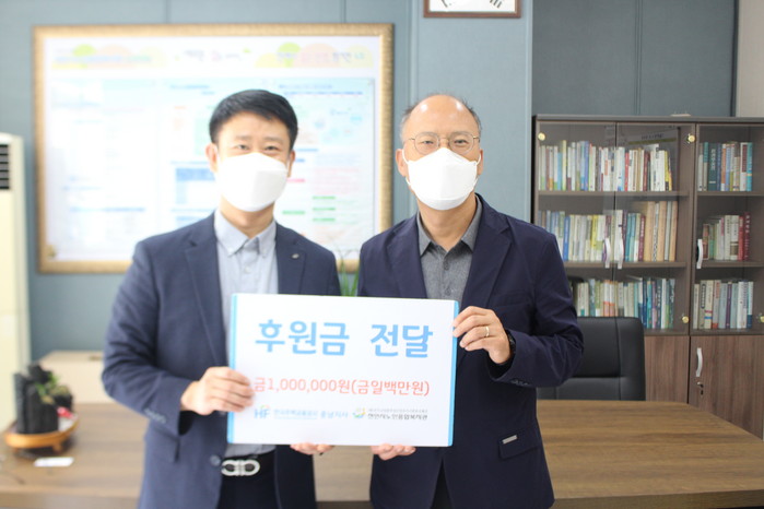 ▲ 강희수 지사장이 후원금을 전달하고 있다. (사진=한국주택금융공사 충남지사) |