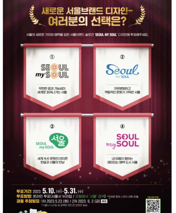 ‘서울 마이 소울(Seoul, my soul)’은 지난 최종투표 총 658,234명이 참여한 조사에서 1위(63.1%)를 차지해 ‘서울 포 유(Seoul for you)’(36.9%)를 제치고 국내ㆍ외에서 가장 선호하는 슬로건(구호)으로 선정됐다.