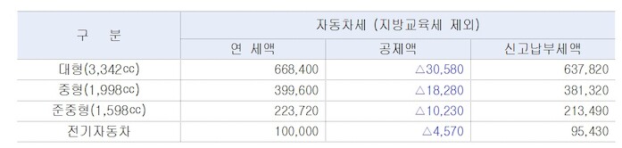 | ▲ 2023년 1월 비영업용, 신차 기준 자동차세 연세액 예시 (단위:원) (자료=서울시) |