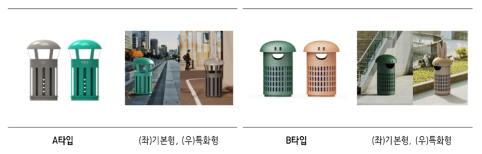 이러한 과정을 거쳐 새로운 디자인을 입은 가로 쓰레기통은 간결한 형태에 풍성한 곡선을 더한 A타입, 쓰레기통에 웃는 표정을 입혀 펀(fun) 요소까지 가미된 B타입 등이다.