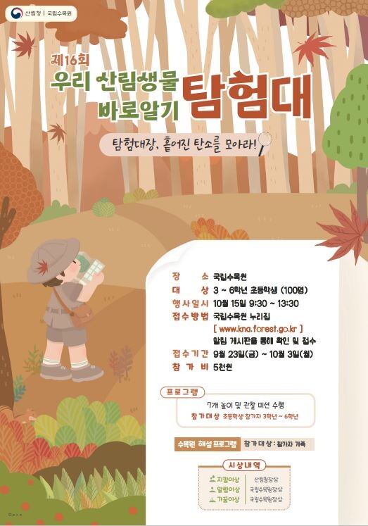 [세계로컬타임즈 이효진 기자] 산림청 국립수목원은 초등학생 대상 에코티어링 프로그램인 ‘우리 산림생물 바로알기 탐험대’를 10월 15일 개최한다.