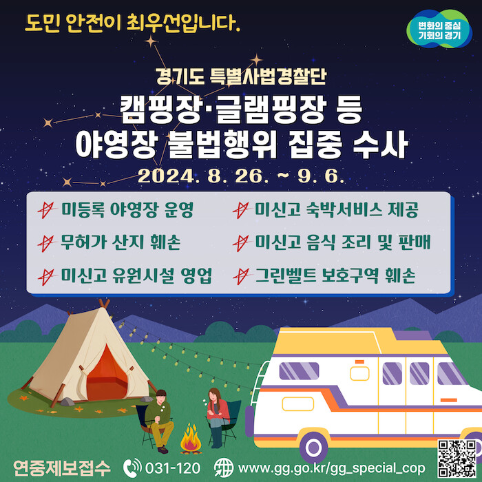 [세계로컬타임즈 이효진 기자]경기도 특별사법경찰단이 야영장에서 발생할 수 있는 안전사고 예방을 위해 각종 야영장 불법행위를 8월 26일부터 9월 6일까지 집중 수사한다.