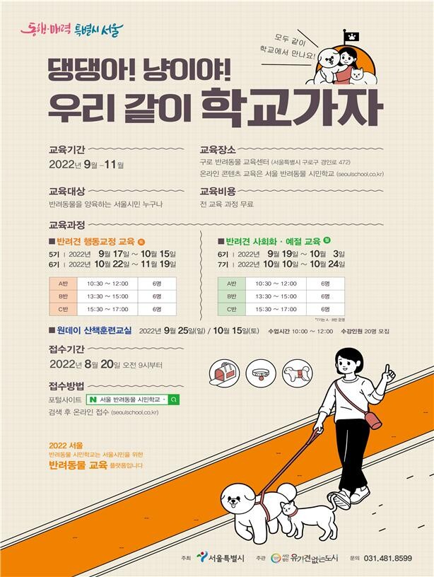 ‘서울 반려동물 시민학교’ 누리집에서 20일부터 신청할 수 있으며 교육 신청은 선착순으로 마감된다.