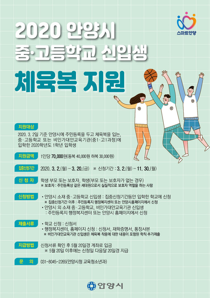 [세계로컬타임즈 최성우 기자] 안양시는 2020학년도 중·고등학교 신입생 교복·체육복 구입비용 지원을 시작한다.